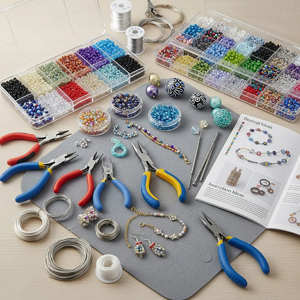 Complete jewelry-making kit featuring 500 assorted beads, findings, wire, and essential tools. Includes pliers, cutters, and a comprehensive guide. Perfect for beginners and experienced crafters.